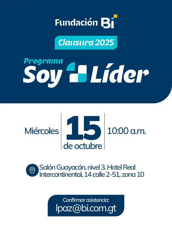 Inicio > Eventos > Yo Soy LíderYo Soy Líder Del 15 de octubre del 2025 al 15 de octubre del 202510:00 am Hotel Intercontinental, Salón Guayacán Gratis Información del evento Conferencia de Prensa: Yo Soy Líder Hora: 10:00 a.m. Lugar: Hotel Intercontinental, Salón Guayacán Se requiere confirmación de asistencia: lpaz@bi.com.gt Invitación para medios de comunicación Links relacionados al eventoFacebookInstagramXYoutube Emprender ← Anterior Siguiente → Más EventosInterpretación de cuentas en estados financieros: claves para comprenderlos: Gratis Detalles del evento Formalizar tu esfuerzo es el primer paso hacia grandes logros: Gratis Detalles del evento Perspectivas Económicas Honduras 2026: Gratis Detalles del evento